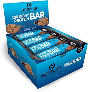 Bodylab24 Crunchy Protein Bar Schoko Brownie 12 x 64g Vorratsbox, knuspriger Protein-Riegel mit Schokoladenüberzug, mit 20g Eiweiß pro Riegel, High-Protein Low-Sugar, Eiweiß-Riegel mit wenig Zucker
