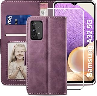 YATWIN Handyhülle Samsung Galaxy A32 5G Hülle +1 Stück Panzerglas Schutzfolie, Klapphülle Samsung A32 5G Premium Leder Brieftasche Schutzhülle [Kartenfach][Stand] Handytasche Case für A32 5G, Weinrot